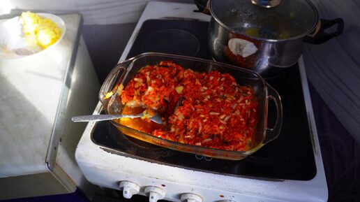 Дешевый но вкусный завтрак для простых пенсионеров и взрослого сына Готовлю минтай с картошкой морковью и луком Кормлю животных в деревне