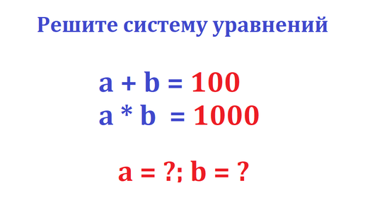 Решите систему уравнений; a + b = 100; a * b = 1000.. Найдите a; и b