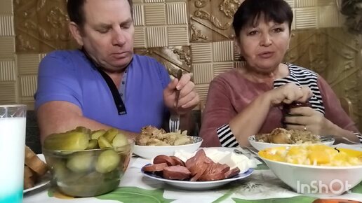 Мукбанг. Макароны с подливой и голенью, огурцы квашеные, перец Чили, тыквенная каша и молоко. 😋👍