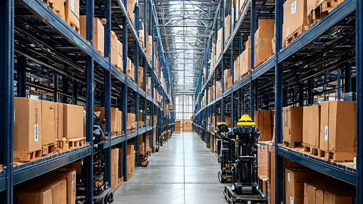 Роботы на складе подвозят стеллажи для размещения на них товаров