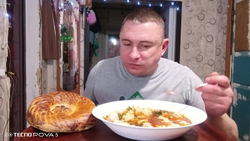 Мукбанг/обжор/пельмени с бульоном, запечённая лепёшка/
