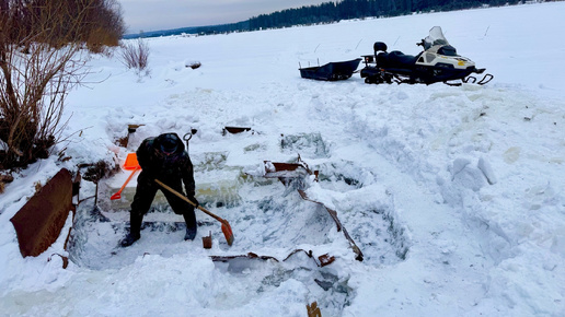 Достаем затонувшую баржу из реки. Трудовой металл. Везем валежник на снегоходах.