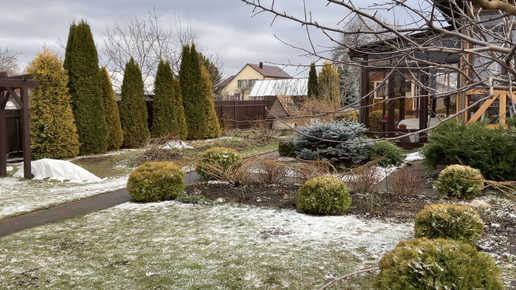 Зеленый сад в начале февраля. Розы с укрытиями и без. 04.02.2025