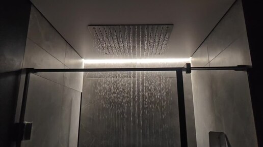 Натяжной потолок в душевой по дизайнерскому решению.