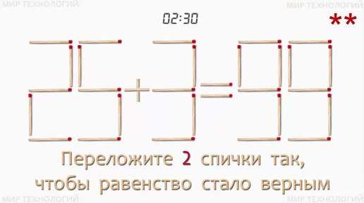 Задача со спичками 408 (3). Переложите 2 спички так, чтобы равенство стало верным (25+3=99).