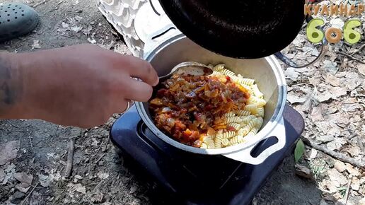 Макароны по-рыбацки с овощной заправкой на берегу реки