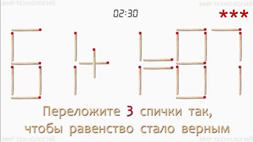 Задача со спичками 408 (4). Переложите 3 спички так, чтобы равенство стало верным (61+1=87)