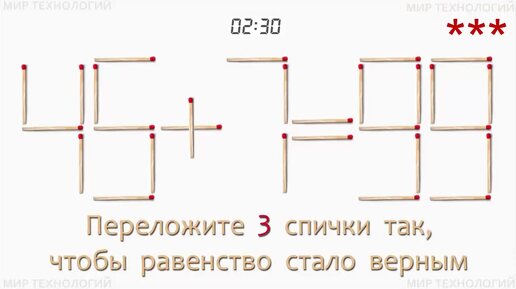 Задача со спичками 411 (4). Переложите 3 спички так, чтобы равенство стало верным (45+7=99)