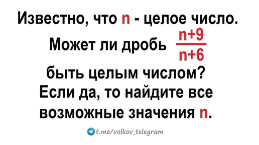 Известно, что n - целое число. Может ли дробь (n+9)/(n+6) быть целым числом?