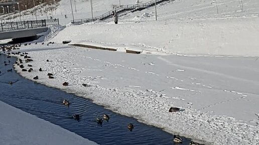 Утки зимуют и отлично переносят мороз. Но это пока ещё есть где плавать. Узкая полоска полыньи и кормёжка от неравнодушных горожан.