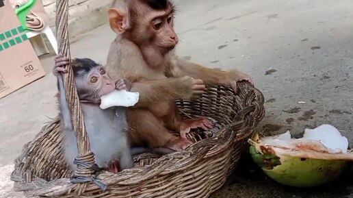 Обезьянчик и братишка кушают кокосы в корзиночке