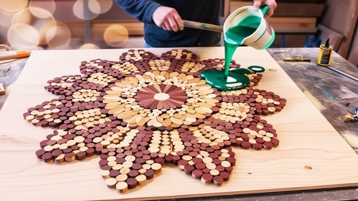 Столешница из деревянных кружков и фанеры. Стильный кофейный стол своими руками.