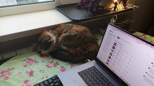 Муся греется на батарее