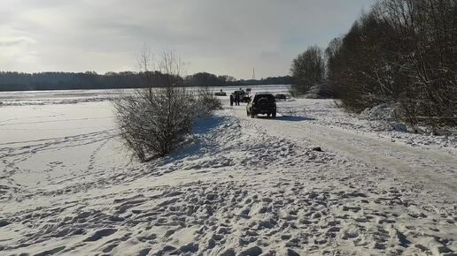 Дети катаются с горки и наблюдают за спасением. Машина провалилась под лёд.
