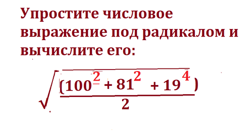 Упростите числовое выражение под радикалом и вычислите его: √[(100^2 + 81^2 + 19^4)/2]