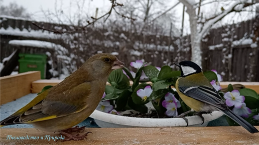 На кормушку прилетели Зеленушки, Большие Синицы и Воробьи (01.01.2025 года)