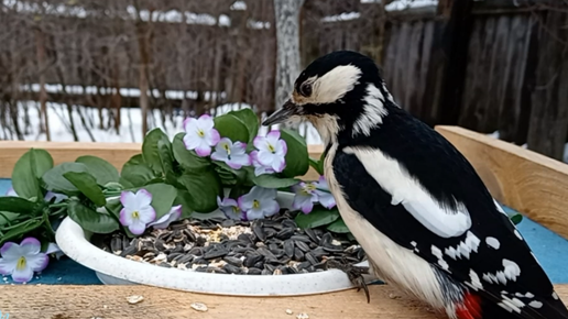 На кормушку прилетели Сойки, Большие Синицы, Дятлы, Синицы Лазоревки и Воробьи (02.01.2025 года)