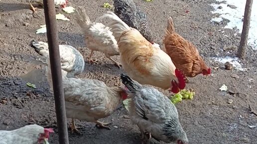 Кормим кур на выгуле. У петухов перекличка.