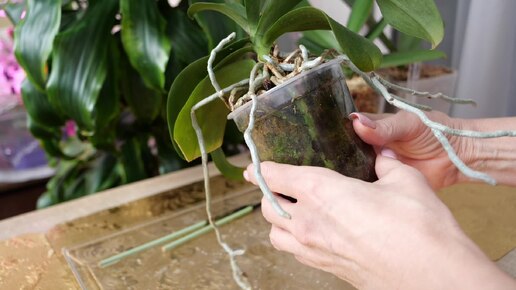 У орхидеи постоянно поникают листья. Определить причину. Посмотрим что в горшке и пересадим.