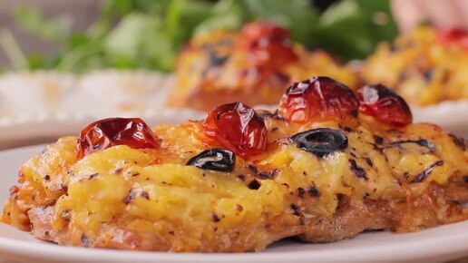 Нежное, сочное мясо с картофельным пюре, сыром, луком и томатами, запеченное в духовке.