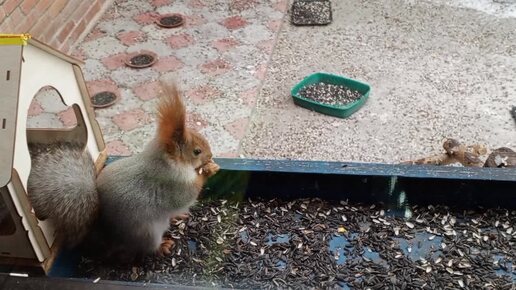 Белки сидят в любимой кормушке.Карта на корм зверятам 2202 2062 6013 7323