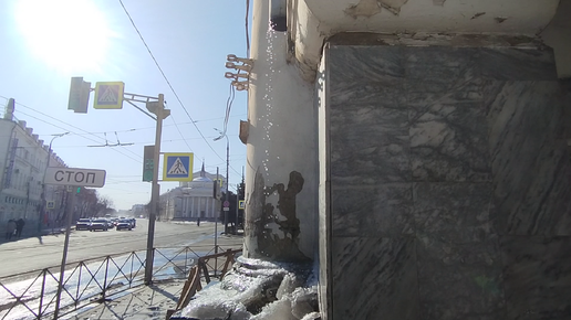 В городе здания. Из трубы течёт вода