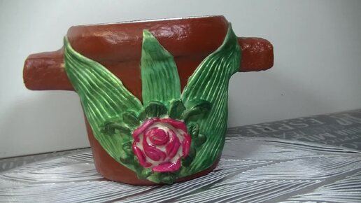 Кашпо из ведра с ручками и розочкой своими руками .