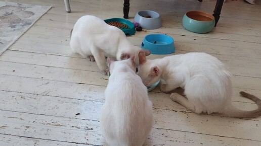 Котята проголодались, уплетают за обе щеки, и показываю, где черепаховость у Жульки