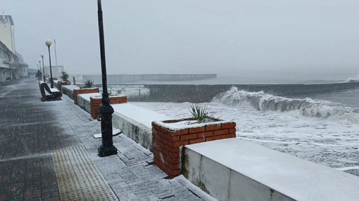 Погуляли на морской стороне ЖД вокзала Адлер. Погода дрянь, снова холод и снег, море штормит, 24.02.2025.