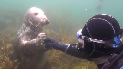 Смущённый дайвер не понимает, что хочет от него тюлень. Но затем животное берёт его за руку!