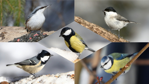 Сотрапезники на лесной кормушке: лазоревки, большие синицы, буроголовые гаички, московки, а также поползни.