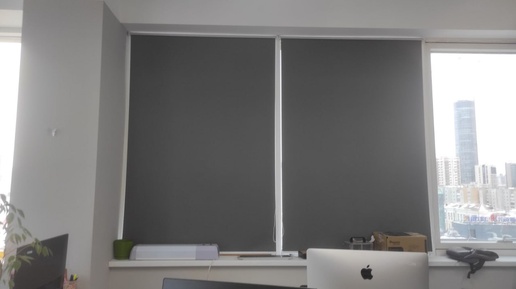 Рулонные шторы MINI в популярном тёмно-сером цвете на окна в офис, для защиты от палящих солнечных лучей и бликов при работе на компьютере.
