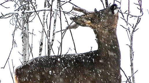 Косуля (самец) обедает во время снегопада