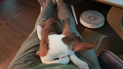 Сама пылесос запустила, сама на пылесос почирикала, но на папке спокойнее...