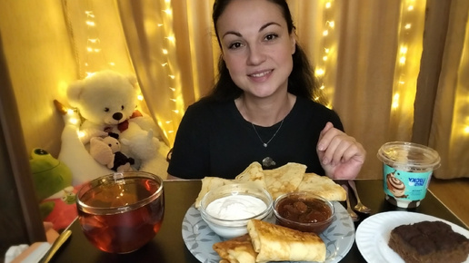 Мукбанг🥞Блинчики с курицей и сыром, со сметаной и вареньем🍯🥰😋 Всех поздравляю с Масленицей! 💞🥰