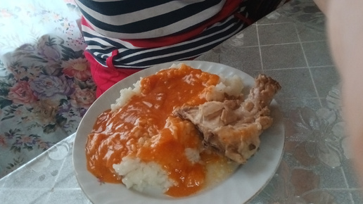 Мукбанг/ Ужин. Рисовая каша с подливом и с курочкой. И ещё к чаю блины.