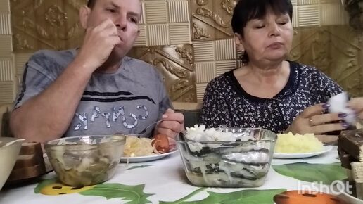 Мукбанг. Пюре с сарделькой, килька, квашеная капуста, маринованные грибы, компот и вафли. 😋👍