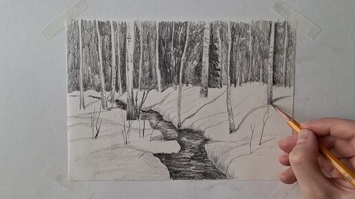 Зимний пейзаж для начинающих простым карандашом