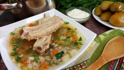 Рассольник с рёбрышками. Рецепт с перловкой и солёными огурцами