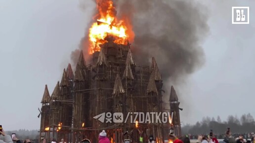 В «Никола-Ленивце» сожгли на Масленицу 26-метровую «Мельницу»