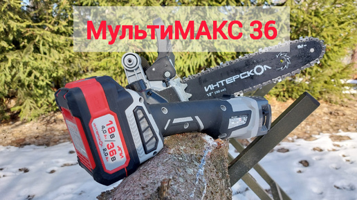 Мультимакс 36 от Интерскол. Модули: цепная пила, УШМ, сабельная пила, дисковая пила в работе