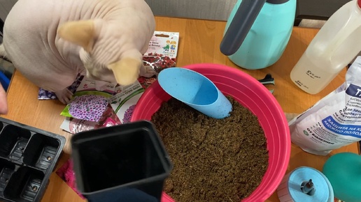1 марта. Сею петунию и показываю где ее прячу от кошки.