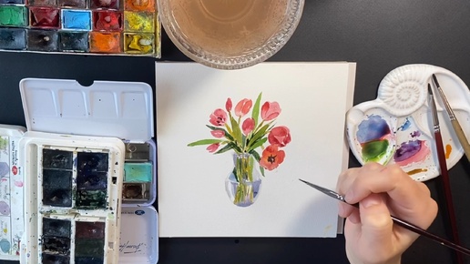 Рисуем букет красных тюльпанов в стеклянной вазе к 8 марта