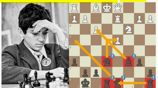 Эльмар Магеррамов жертвует ферзя юному каспарову ходом 37.♘f5 с красивой победой. Но это окончание еще доиграть надо уметь (Баку, 1979, 1-0)