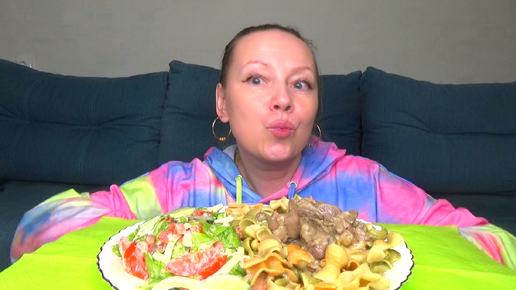 Мукбанг красивые макароны бантики, печень курочки тушеная, салатик. еда.
