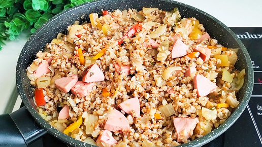 Обед за 15 минут: Гречка с овощами с сардельками на сковороде