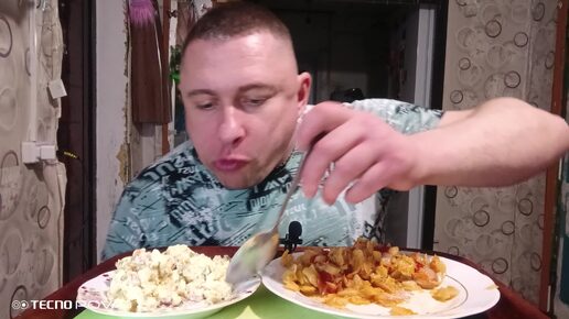 Мукбанг/обжор/тушёная капуста с сардельками, салат оливье, свежий огурец,репчатый лук/