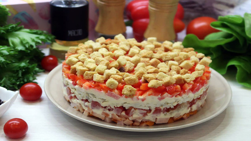 Салат Астра: слоеный салат с копчёной курицей и сухариками