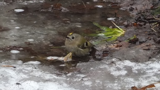 Желтоголовый королёк купается в лужице