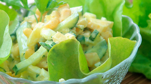 Легкий и вкусный салатик с кукурузой и огурчиками. Без майонеза.